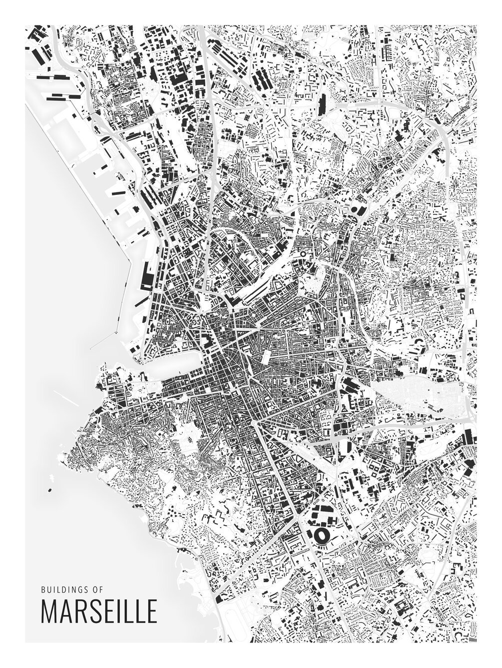 A large scale figure-ground diagram, showing all buildings of Marseille in mesmerizing detail. It looks great from far away, where you can spot the structure of the city, as well as close by, where you can immerse yourself in the urban fabric and search for well-known buildings.