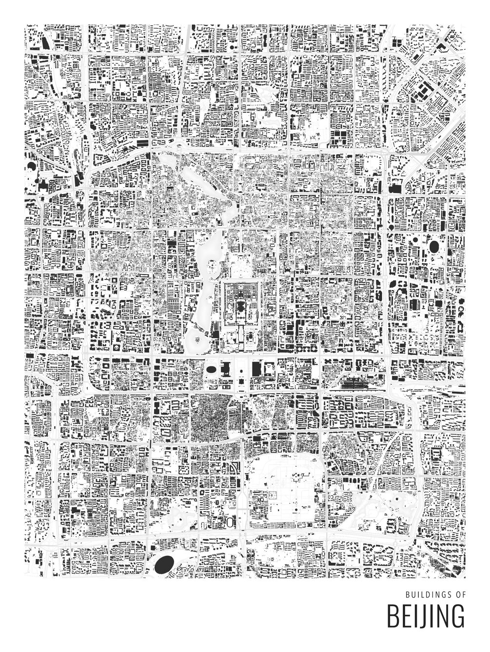 A large scale figure-ground diagram, showing all buildings of Beijing in mesmerizing detail. It looks great from far away, where you can spot the structure of the city, as well as close by, where you can immerse yourself in the urban fabric and search for well-known buildings.